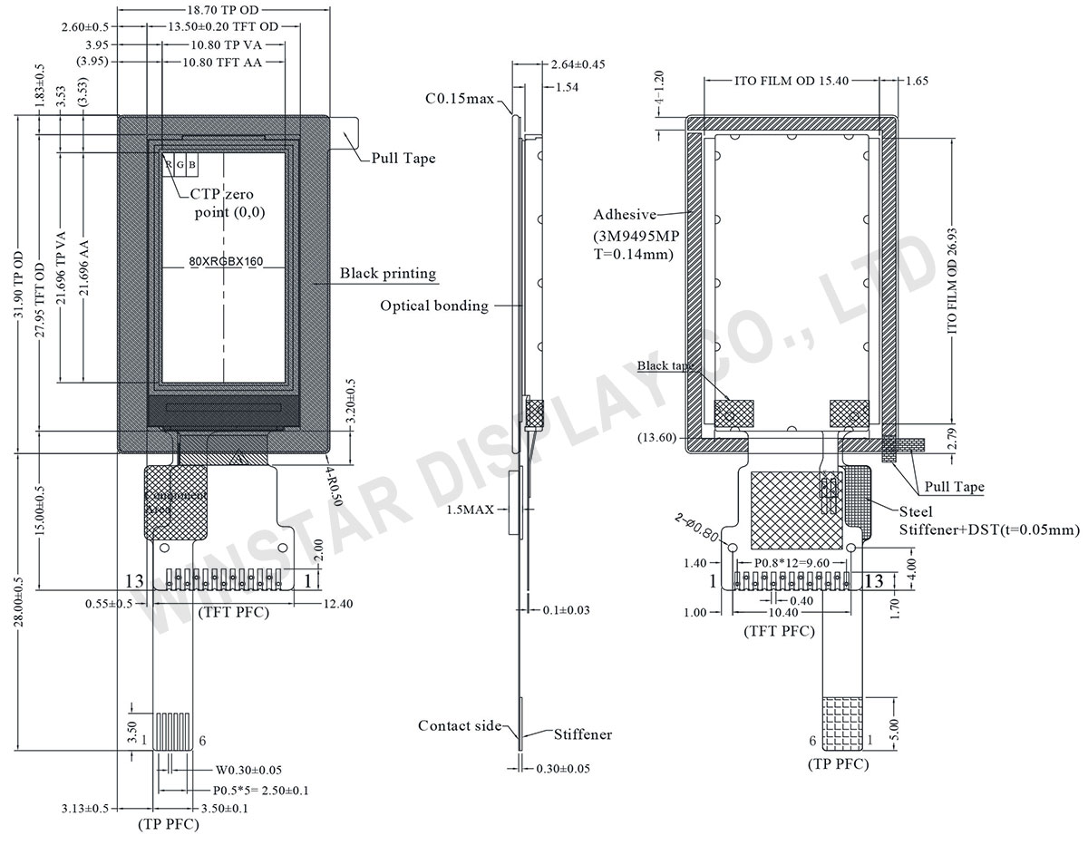 WF0096ATYAA3DNF10 is a 0.96 inch IPS TFT-LCD display featured with Optical bonding (OCA) capacitive touch screen on module, made of resolution 80×160 pixels. This 0.96 inch Mini TFT LCD Display is portrait mode with IPS (In-Plane Switching) Panel which having the feature of wider viewing angle of Left:80 / Right:80 / Up:80 / Down:80 degree (typical) and the capacitive touch screen is adopted optical bonding technology which is a silicone Optical Clear Adhesive (OCA) process that fills air gaps between components in LCD displays, that having the advantage of increases the ruggedness of the display and improving durability to having better able to resist scratches, fluids, stains and dirt. This TFT model is built in with FT3267 touch panel IC on module, that supports I2C interface, and one detect point for capacitive touch screen.