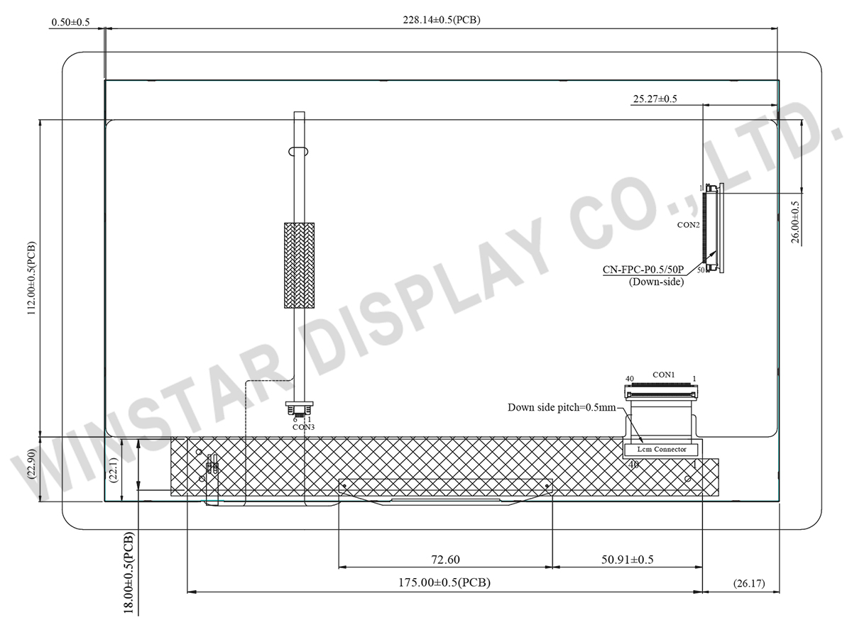 WF101KTYJPLNG0 is a 10.1-inch IPS TFT-LCD module with Projected Capacitive Touchscreen (PCAP). This TFT-LCD module, built-in with EK79202B1, supports LVDS interface with a high resolution of 1280 x 800 (WXGA) pixels, brightness of 300 nits, and a contrast ratio: of 1000:1. WF101KTYJPLNG0 is featured with IPS panel which having the advantages of the wider viewing angle of Left:80 / Right:80 / Up:80 / Down:80 degree (typical) and having HD resolution (1280 horizontal by 800 vertical pixels).