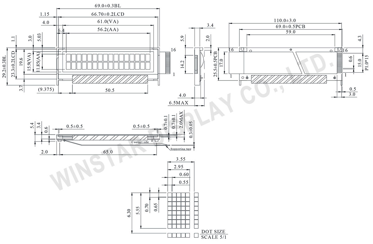 Winstar 16×2 character display module WH1602V2 is having thinner LCD panel of 0.7 mm in thickness. This display is built-in with ST7066U controller and has the outline dimension of 66.7 x 23.3 mm and VA size of 61 x 15.9 mm. There are two kinds of backlight as options which are Blue LEDs and Yellow-Green LEDs. The WH1602V2 16×2 Character Display Module is using 2908 LED dices which lifetime is around 50K hours. This type of module can operate at temperature from -20℃ to + 70℃; its storage temperature ranges from -30℃ to + 80℃.