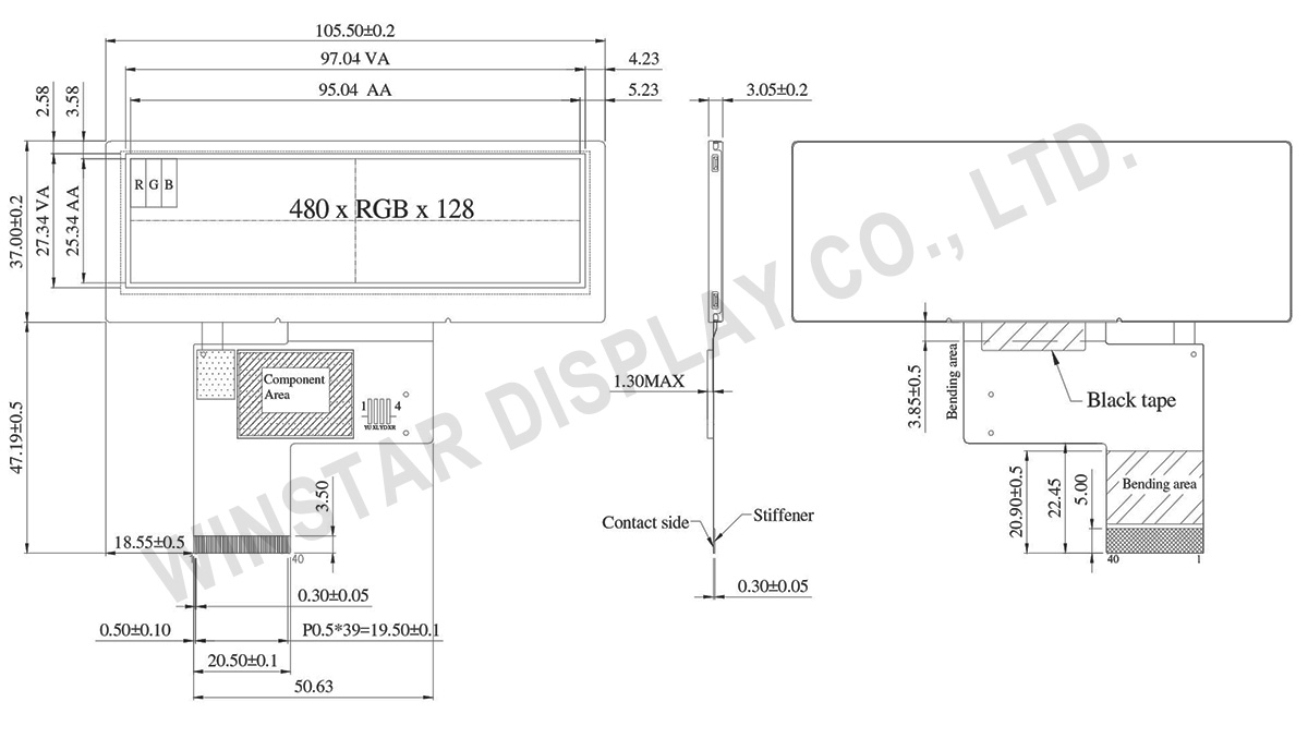 WF39ETWASDNN0 is a 3.9-inch bar-type TFT LCD with IPS 80/80/80/80 wide viewing angles. It has 480×128 dots resolution and 500 cd/m2 brightness. The module dimension is 105.5(W) × 37.0(H) mm, and the active area is 95.04 × 25.34 mm. The module is built-in with SC7283 driver IC, supporting 24-bit RGB interfaces.