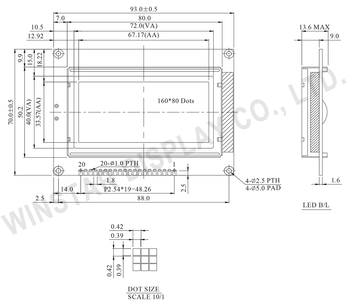 WG16080D is a monochrome LCD 160×80 dot matrix display module which is having the module dimension of 93×70 mm and AA size of 66.17×33.57 mm; diagonal size 3 inch LCD Display. This WG16080D model is built in with RA6963 controller; it communicates via 8080 8-bit parallel interface; 5V power supply negative voltage . This module is available for graphic mode or Character Generator mode (Character font) optional. It can be operating at temperatures from -20℃ to +70℃; its storage temperatures range from -30℃ to +80℃.