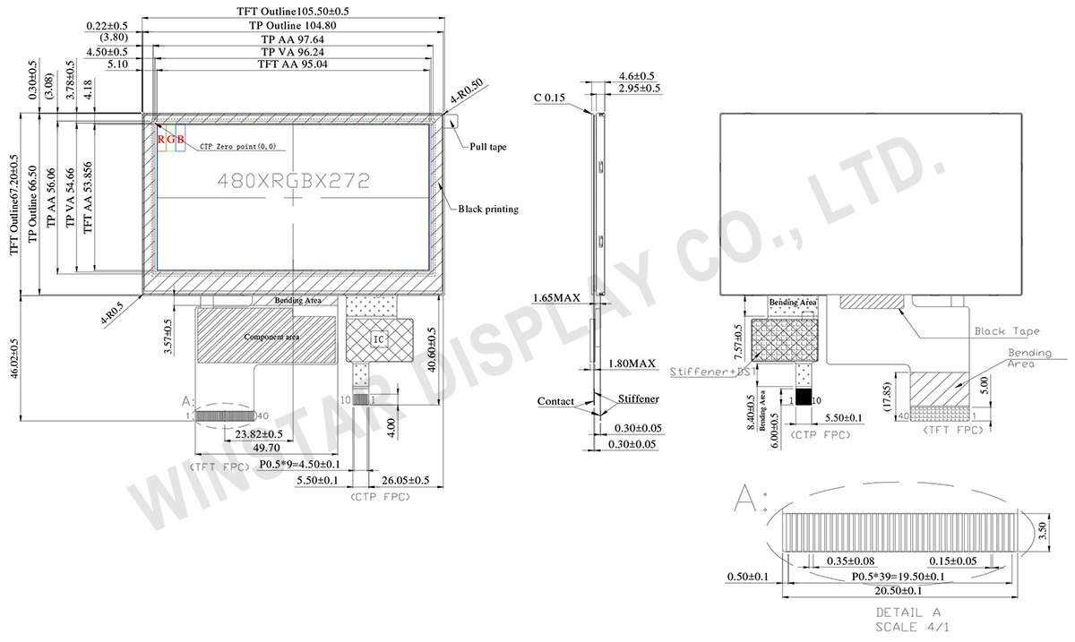 WF43VSZAEDNGA is a 4.3-inch TFT touch display with the O-Film wide viewing angles. It has 480×272 dots resolution and 600 cd/m2 high brightness. The module is built-in with ST7282 driver IC, supporting 24-bit RGB interfaces. It comes with a Projected Capacitive Touch Panel (PCAP), which can simultaneously detect 5 points of contact. This 4.3″ TFT touch module is ideal for outdoor applications requiring high brightness and colorful image display.