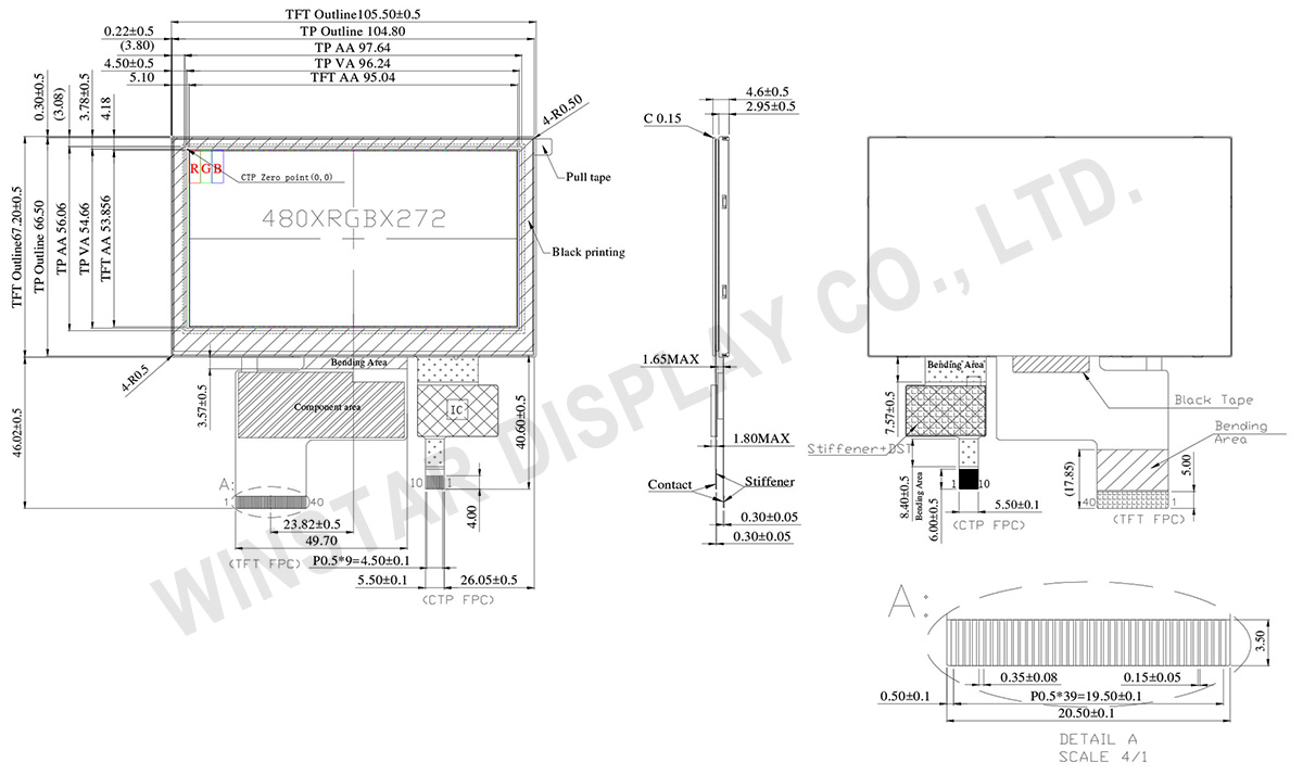 WF43VSIAEDNGA is a 4.3-inch TFT LCD module with a Projected Capacitive Touch Panel (PCAP). It is a color TFT display with 480×272 dots resolution and 700 cd/m2 brightness. The module is built in with ST7282 driver IC, supporting 24-bit RGB interfaces. WF43VSIAEDNGA is perfect for outdoor measuring equipment, industrial devices, testing equipment, measuring instruments, etc.