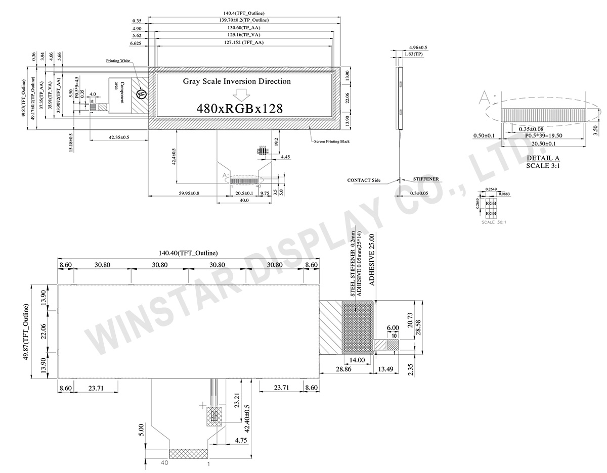 The module is built-in with ST7252 driver IC with 24-bit RGB interfaces. The supply voltage for LCM (VCC) is from 3.0V to 3.6V (typical value: 3.3V). This bar TFT can operate at a temperature range from -20℃ to +70℃, and its storage temperatures are from -30℃ to +80℃.