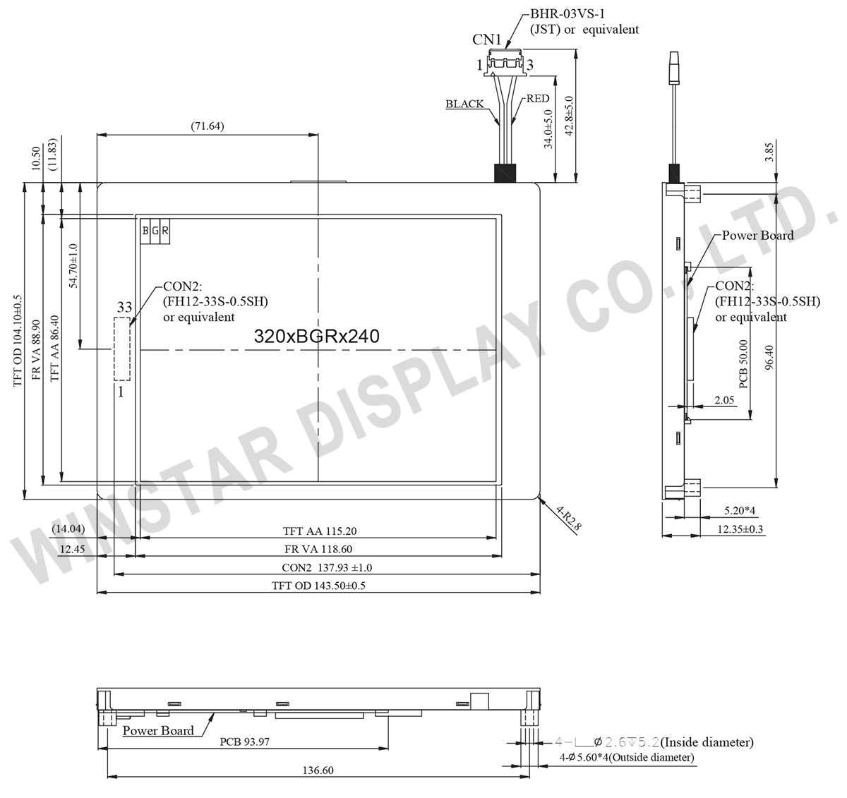 WF57WTLECDNN0 is a 5.7-inch color TFT LCD module with the controller board. The display has a 320 x 240 dots resolution and 500 cd/m2 brightness. It is equipped with a built-in HX8218+HX8615 driver IC supporting 18-bit RGB interfaces. This TFT module features a frame around the screen with four screw holes. The voltage power supply of the display is from 3.0V to 3.6V, and the typical value is 3.3V. The module dimension is 143.5 × 104.1 mm with an active area of 115.2 × 86.4 mm.