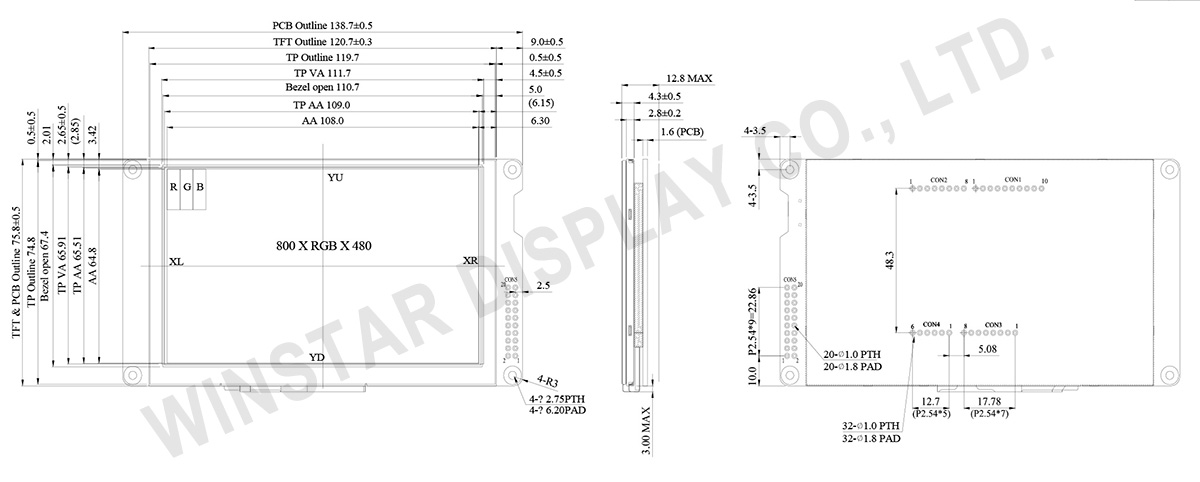 WF50FSYBGDST0 is a 5-inch TFT-LCD module with a resistive touch panel (RTP). It features a resolution of 800×480 dots and a brightness of 650 cd/m². The module dimension is 138.7 x 75.8 mm with an active area of 108 x 64.8 mm and a 5:3 aspect ratio. This module is built-in with BT816Q driver IC which supports SPI/ QSPI interfaces.