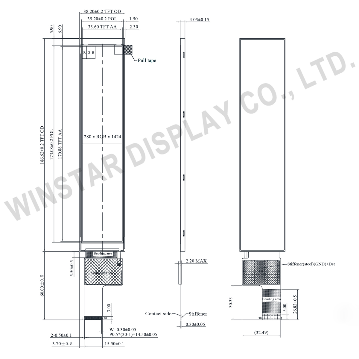 WF70C9SYAB4MNN0 is a 7-inch high-brightness( 1000 cd/m²) bar type TFT LCD display, with module dimensions of 38.2 x 186.62 mm and an active area of 33.6 x 170.88 mm. This 280 x 1424 high-pixel LCD display delivers excellent visual performance and adopts IPS technology, providing wide viewing angles (Left 80°/Right 80°/Up 80°/Down 80°).