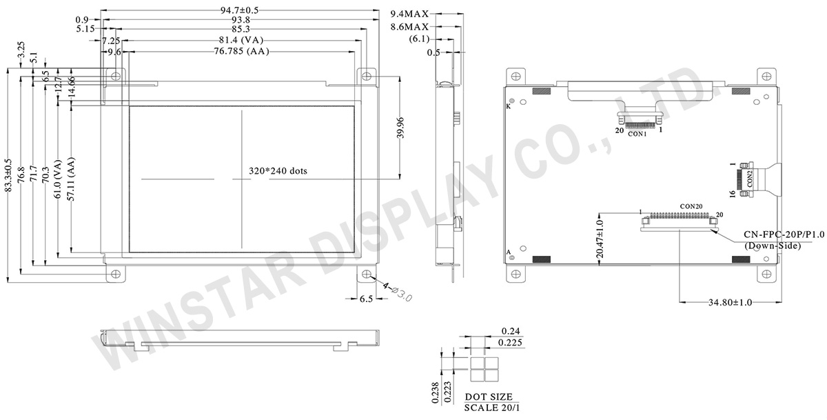 WO320240E model supports 3.3V and 5V power supply voltage. This module can be operated at temperatures from -20°C to +70°C; its storage temperatures range from -30°C to +80°C. WO320240E is available in FSTN positive LCD and with White LED backlight; please contact us if you need different LCD type and LED combination. Please note WO320240E is the replacement of WO320240D since the original IC has been EOL.