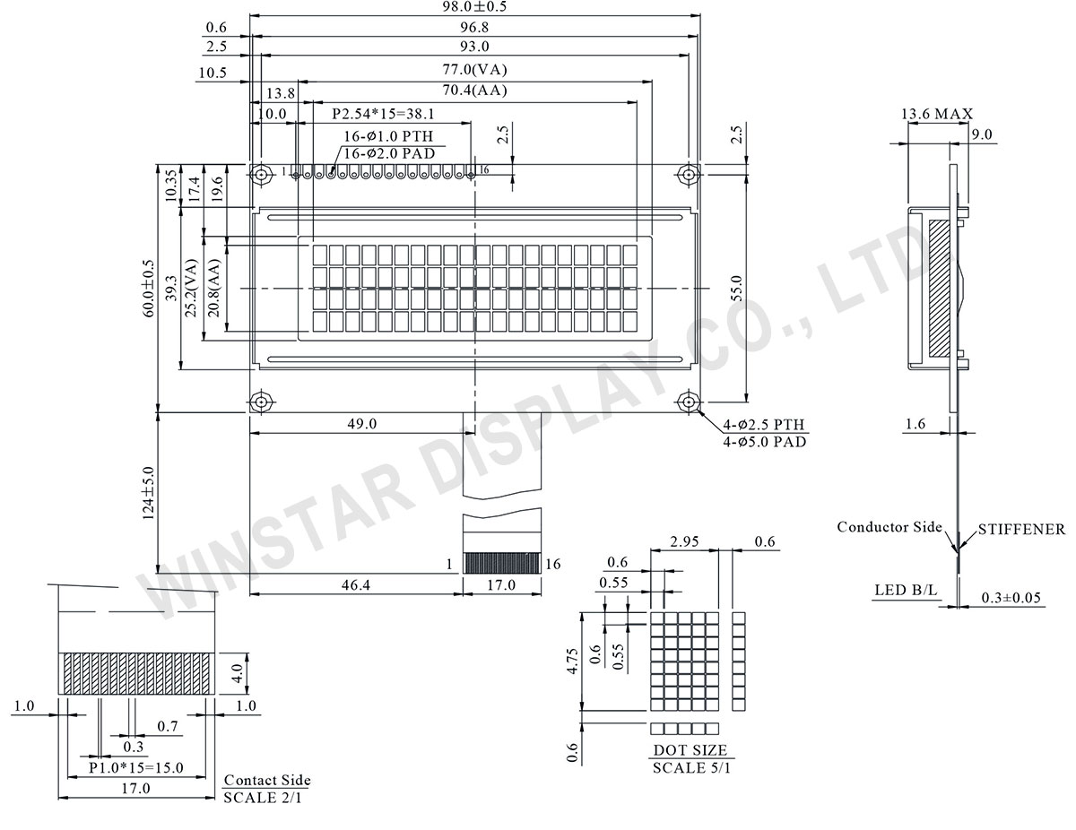 WH2004B is a 20×4 Character LCD display module which is built in with ST7066 controller IC; its default interface is 6800 4/8-bit parallel, +5V power supply. This type of module can be operating at temperatures from -20℃ to +70℃; its storage temperatures range from -30℃ to +80℃. WH2004B is available in several different backlight colors including blue, green, yellow-green, amber, red and white LEDs. The LEDs can be driven by pin 1, pin 2, or pin 15 pin 16 or A/K. The WH2004B have the same outline dimension and VA size, AA size as WH2004A but with different pin out. WH2004A is having 16-pin hole on PCB, as to the WH2004B is having a FFC connector.